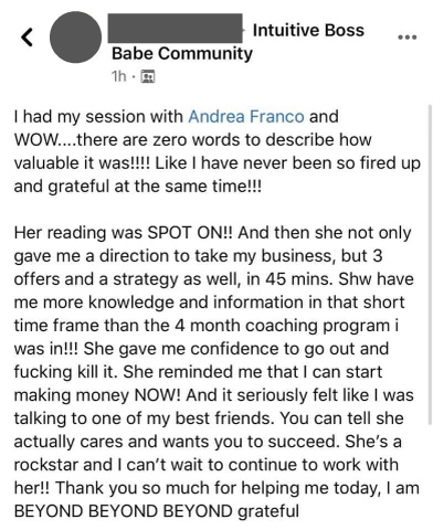 I have had the honor of doing thousands of sessions with women to tap into their business, their guides, and into their full potential as an entrepreneur.